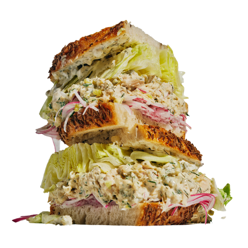 Dill Pickle Mayo, Oil-Packed Tuna, Sliced Red Onion, Rye bread