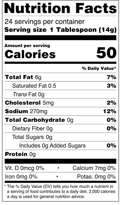 INGREDIENTS: HIGH OLEIC SUNFLOWER OIL, WHOLE GRAIN DIJON MUSTARD (WATER, MUSTARD SEED, DISTILLED VINEGAR, SALT, WHITE WINE, CITRIC ACID, TARTARIC ACID, SPICES), CORNICHONS (GHERKIN, WATER, VINEGAR, SALT, DRIED ONION, CALCIUM CHLORIDE, SPICES, MUSTARD SEED), CAGE-FREE EGG YOLKS, WATER, DISTILLED VINEGAR, SALT, SUGAR, APPLE CIDER VINEGAR, ONION POWDER, MUSTARD FLOUR, XANTHAN GUM.CONTAINS: EGG